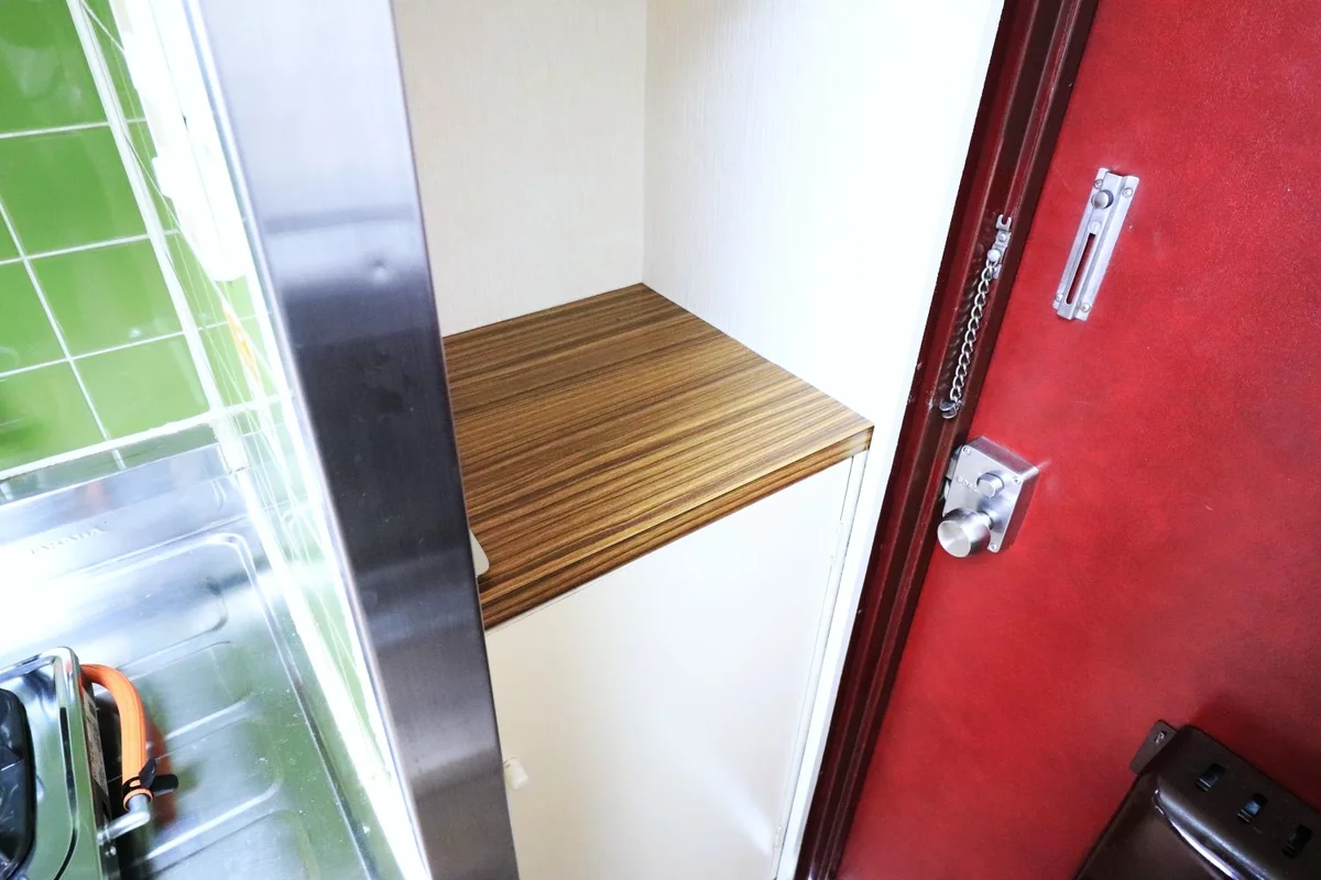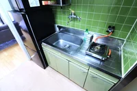まな板・包丁・お茶碗・汁椀・碗・皿・マグカップ・グラス・スプーン・フォーク・お玉・フライ返し・食器用スポンジ・ボウル・消臭スプレー・トイレットペーパー・ティッシュペーパー・ゴミ袋・1口ガスコンロ設置・給湯スイッチあり